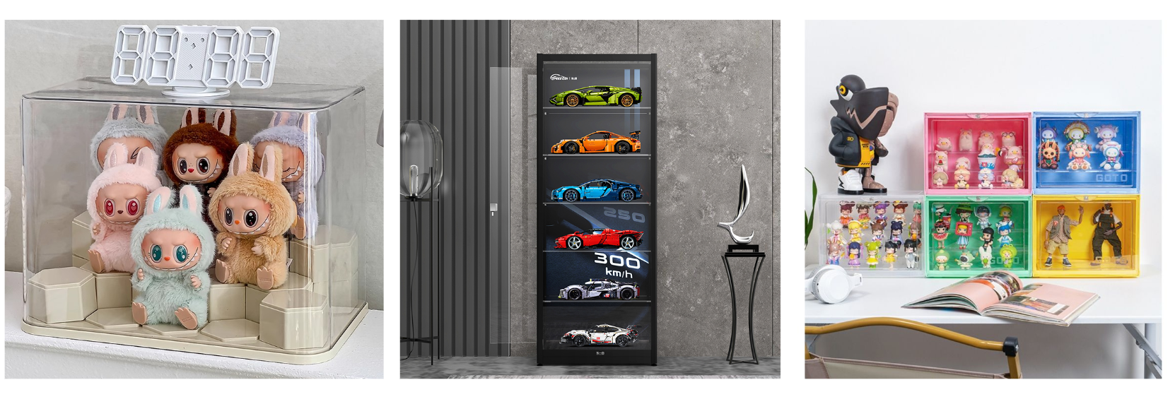 カラフルで可愛らしいフィギュアを映えさせる積み重ね可能なケースです。