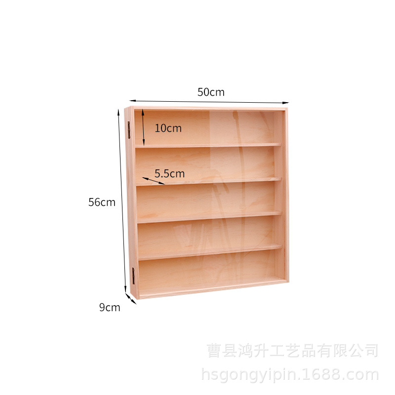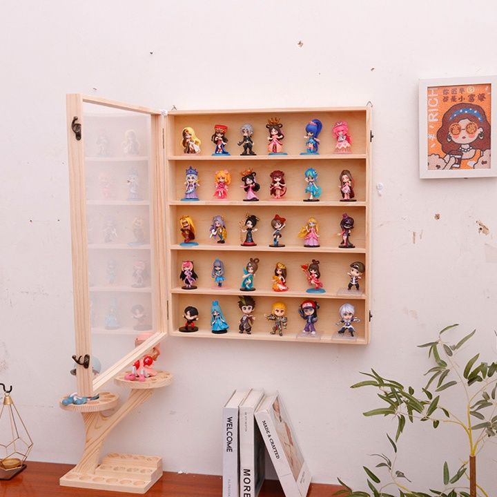 木製の温かみのある素材で作られた壁掛け式の棚は、省スペースで多数のフィギュアを整理して展示できます。